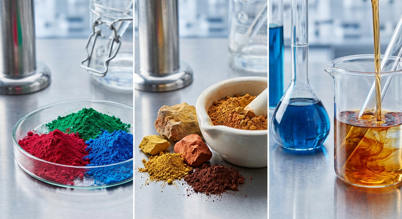 Three complementary colorant types: vibrant organic pigments, stable inorganic pigments, and transparent solvent dyes.